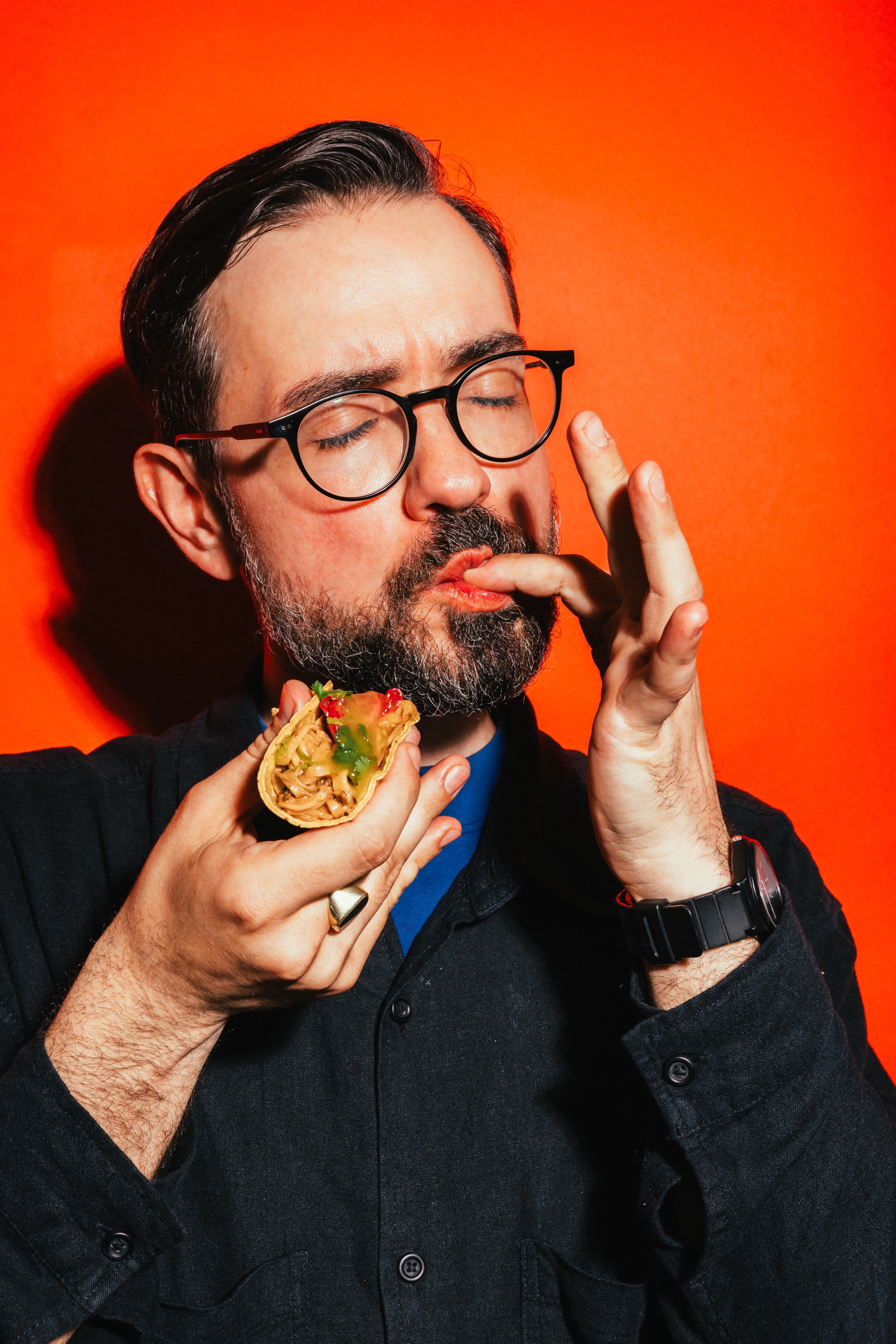 • Ein Mann probiert BRIZZ Fruity Yellow Hot Sauce mit einem Taco vor oranger Wand.