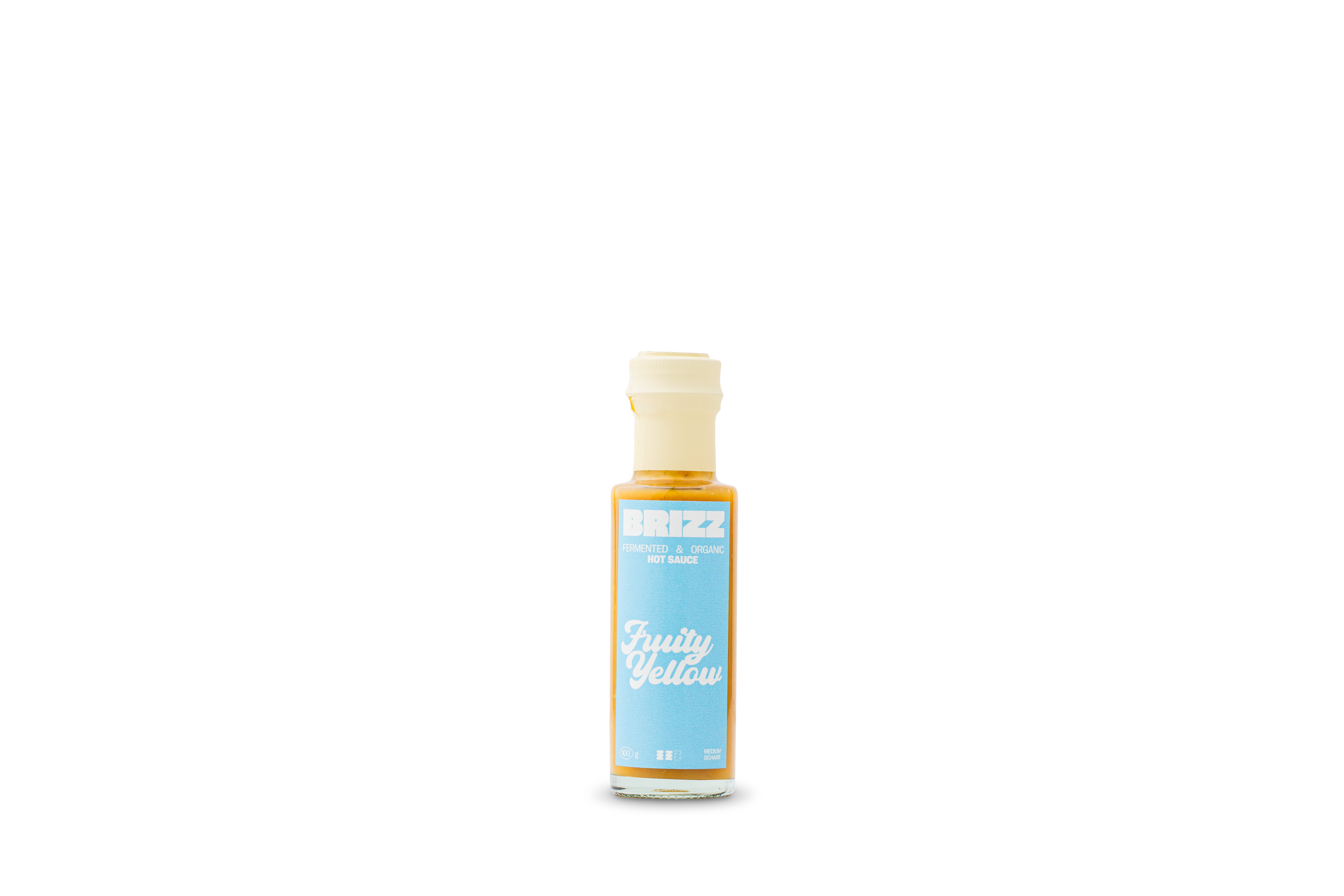 • BRIZZ Fruity Yellow Hot Sauce – Bio-fermentierte gelbe Chilisauce mit Birne und Habanero auf gelbem Hintergrund